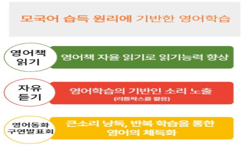 - 큰소리 읽기, 반복, 누적을 활용한 모국어 습득 원리기반의 영어학습