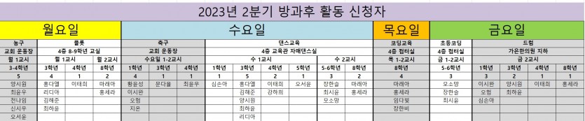 2023년 2분기 방과후 학교 신청자 및 장소 안내입니다